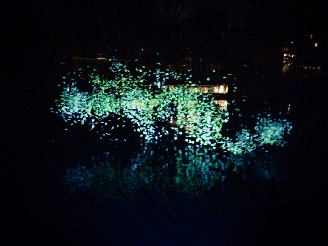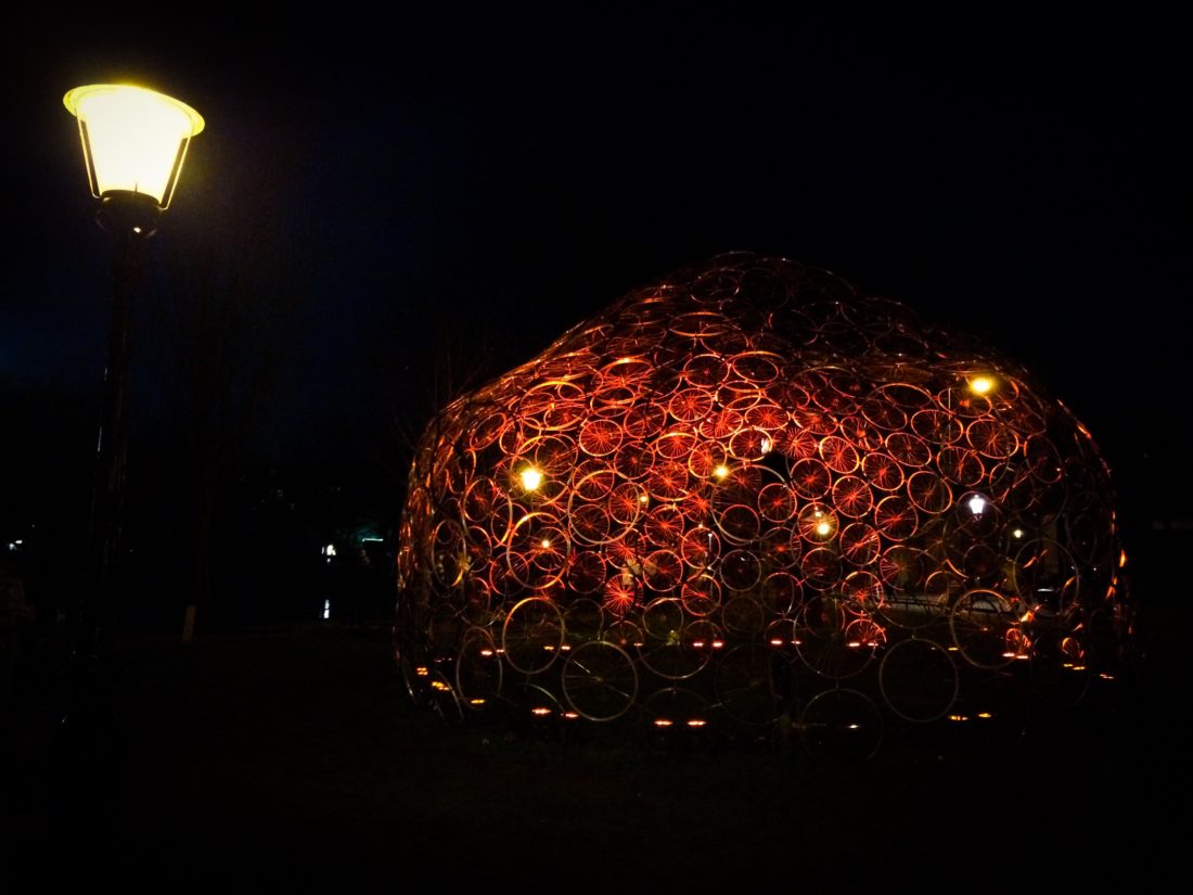 Last year, we did both, the walking and boat tour around the Amsterdam Light Festival installations along the Grachten/ Canals and the harbor area with diving bikes, projections on water fountains to the wonderful art pieces around the Hortus Botanicus Amsterdam, one of the oldest botanical gardens in the world. We like to start our walking tour at the Hermitage Amsterdam. The “festival heart” with info center, café and snack bar was located right behind the museum in the small park. And now, enjoy our photos of last years festival of light in the Dutch capital and we hope you will enjoy this year’s installations, too.