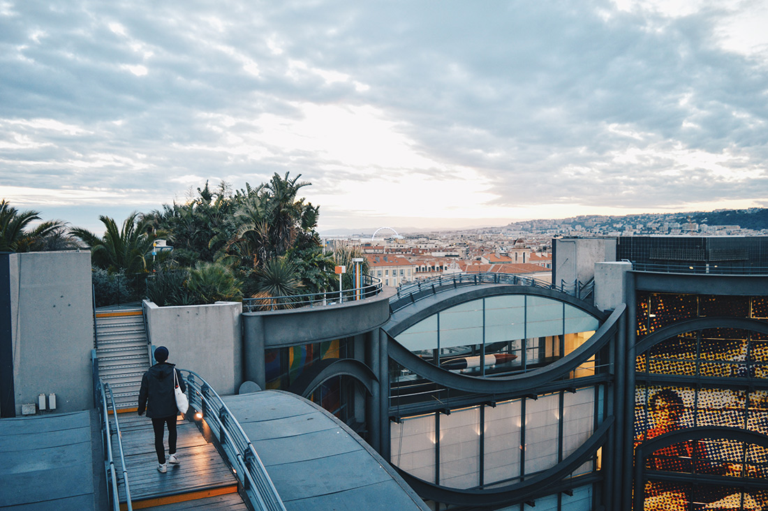The second location for a great view is the MAMAC Nice, the Musée d’art moderne et d’art contemporain – the museum for modern and contemporary art. If you have a French Riviera Pass, the entrance is free. We took the escalator and stairs all the way up to the rooftop. The view over the roofs of the old town is stunning. Especially during sunset. But the MAMAC is more than “just” the view. The museum is hosting great exhibitions, currently, for example, a beautiful exhibition of the artwork of the French artist from Nice, Ernest Pignon-Ernest on the first floor. Impressive and unique.